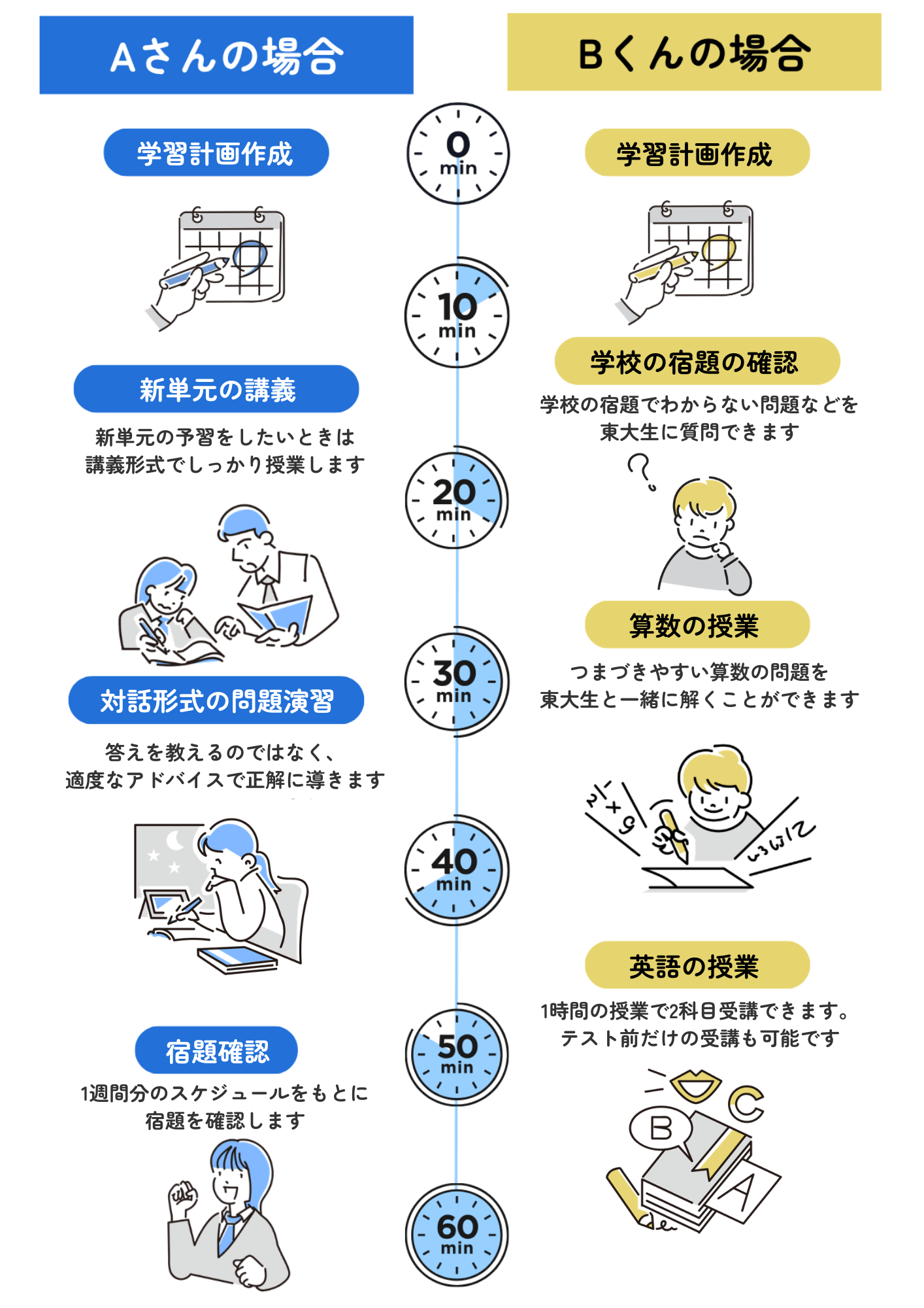 A.授業はすべてオンラインのマンツーマン指導で、1回60分です。講義形式・演習形式など、お子様に合わせて柔軟に対応します。受講頻度は週1回・週2回のプランをご用意しており、時間は原則8:00〜24:00の間で調整可能です。